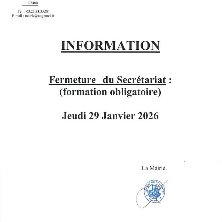 Le secrétariat sera fermé le jeudi 29 janvier (formation du personnel) Réouverture vendredi