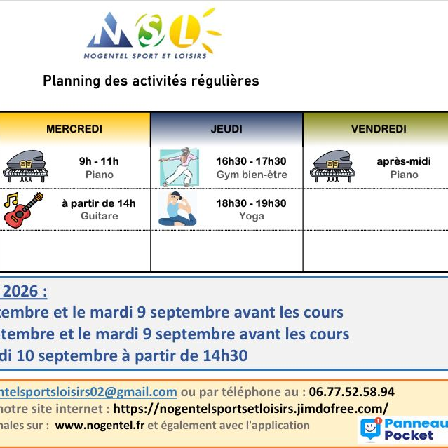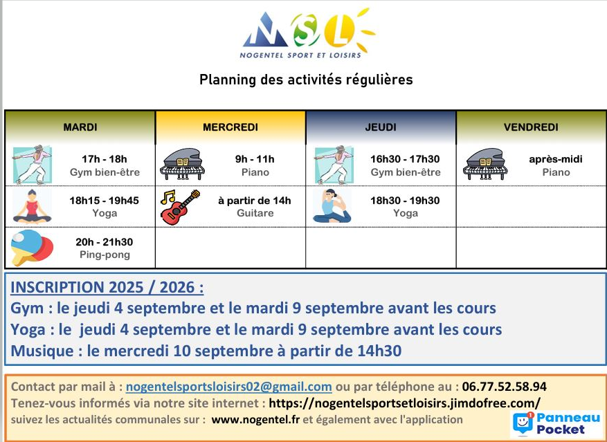 Ecole de musique (piano, guitare) , randonnées pédestres et VTT, foulées de Nogentel, tennis de table , concours de pétanque, gym, yoga, concours de belote, loto, repas, sorties théâtre...