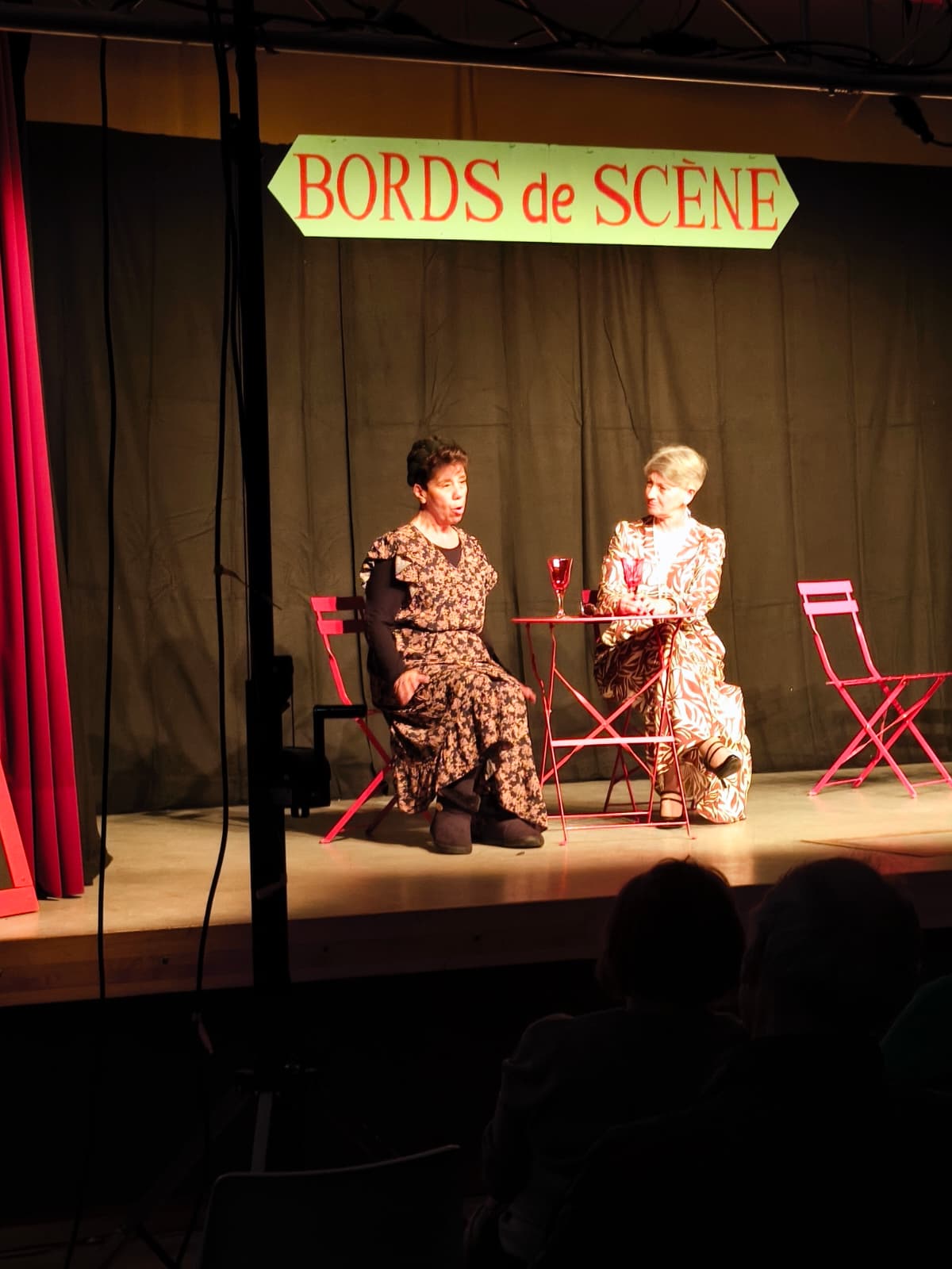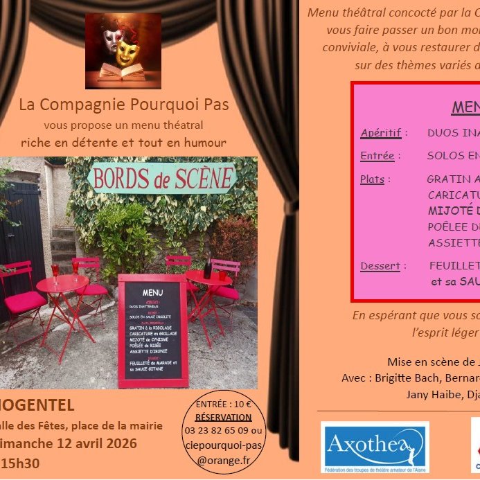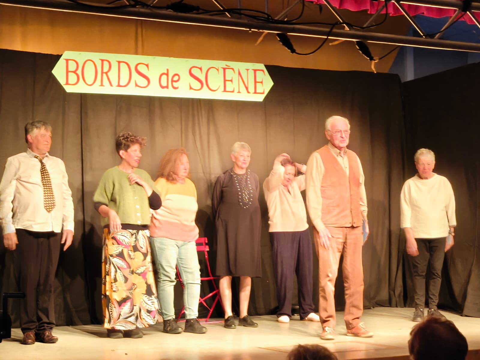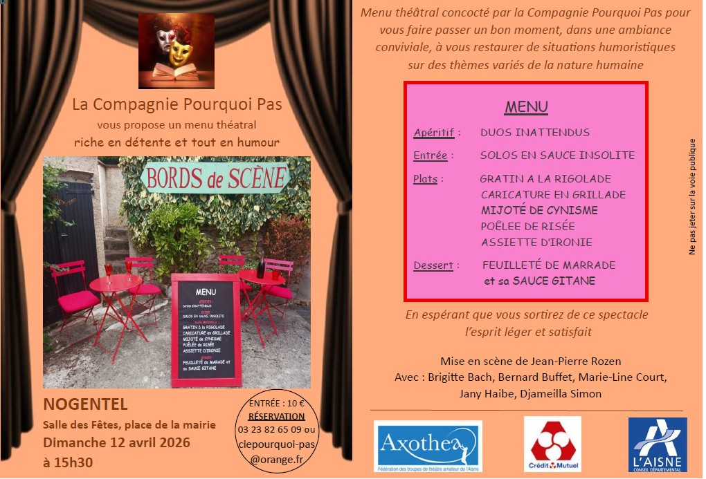 C’est environ 50 personnes qui sont venues applaudir les comédiens de la "Compagnie Pourquoi Pas"ce dimanche . Les situations burlesques de "BORDS de SCENE" ont déclenchées des rires et des applaudissements. Bravo aux comédiennes et comédien et à Jean Pierre Rozen, le méteur en scène.